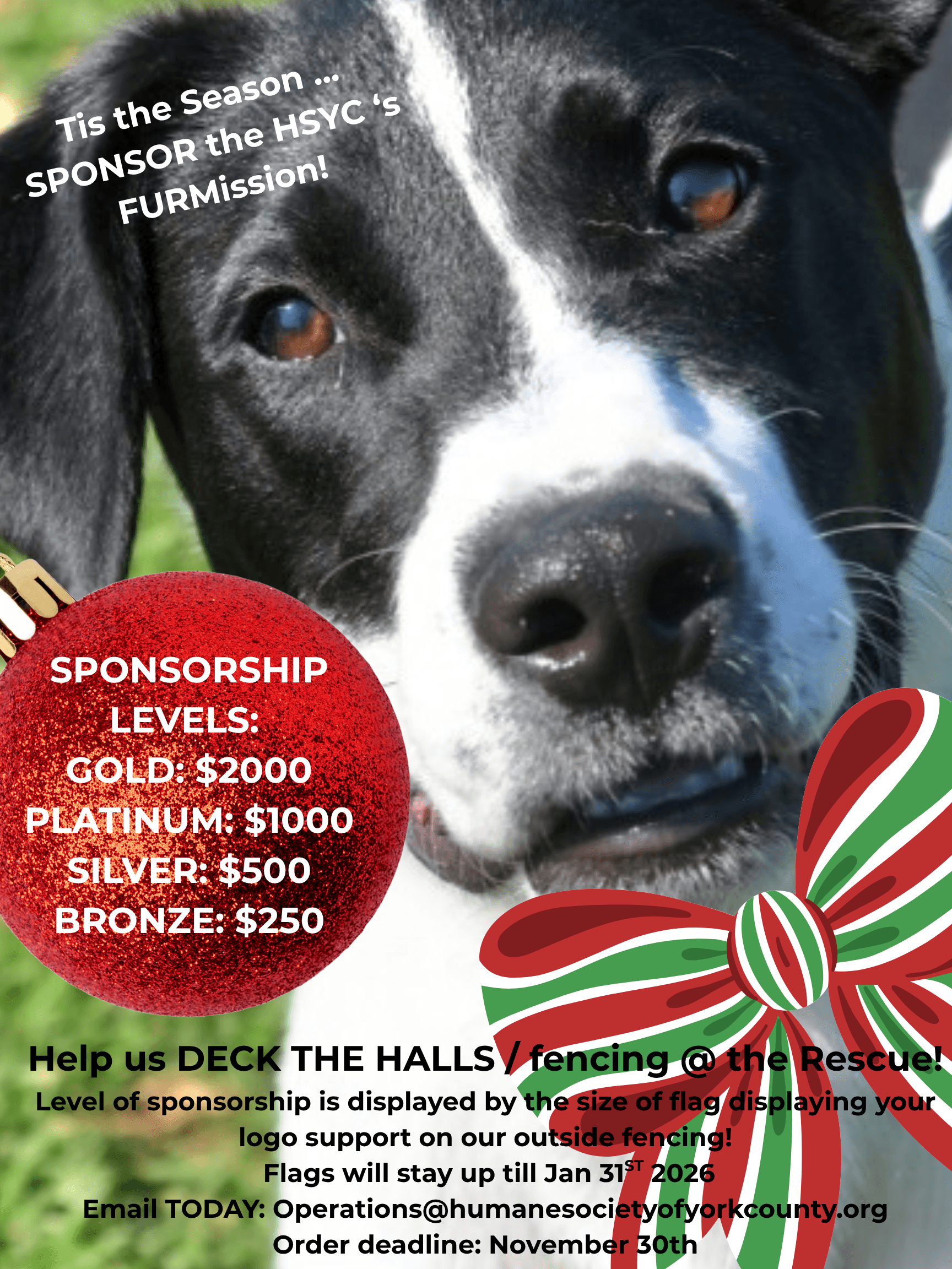Help us DECK THE HALLS aka Fencing @ HSYC where your SPONSORSHIP will be displayed with flags on our Fencing. Levels of SPONSORSHIP is reflected by the size of the flag adorning our fencing. Flags will stay up till Jan 31ST 2026. Email with questions or to provide your LOGO @ Operations@humanesocietyofyorkcounty.org. Order deadline: November 30th